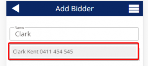 Note: You can edit the contact’s details after adding them eg you wish to give them a bidder number. To do this, press their name, edit the info and press the “back” arrow at the top left. This saves the contact. You can also “swipe left” on the bidder to edit them, or remove them.