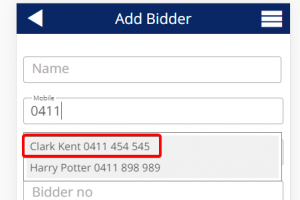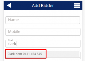 • At the next screen, start entering either the Name, Mobile, or Email address of the bidder. If they are an existing contact they will populate as a selectable option for you. If not, fill in their details and press the “Add Bidder” Button at the bottom of the screen. This will add the attendee as a contact for future use