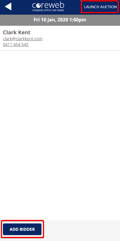 • Once you have found your desired Contact, press on their name to add them to the bidder list. From here you are taken back to the bidder list where you can add more bidders, or launch the Auction. See screenshot below:
