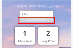 • As the auction progresses, you can enter bid amounts in the “Bid” field, then press on the name, or bidder number of the attendee to register their bid. If a bidder number is not associated with them, only their name will appear in the list. As bids are registered, the system will show you on screen: