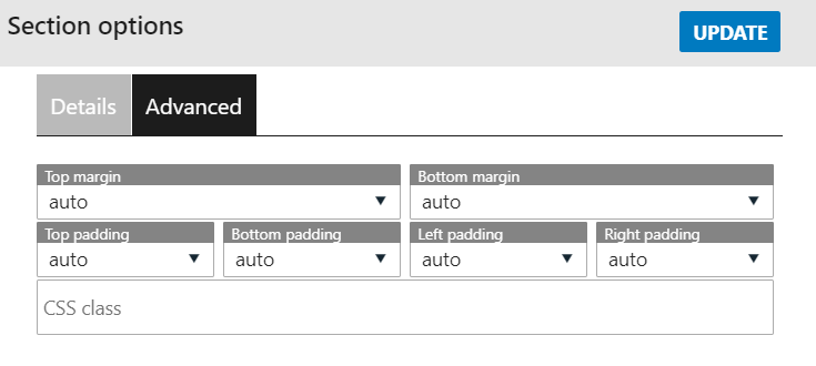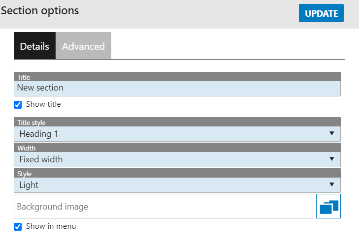 - After clicking this button you are presented with the Details tab for the section’s options: