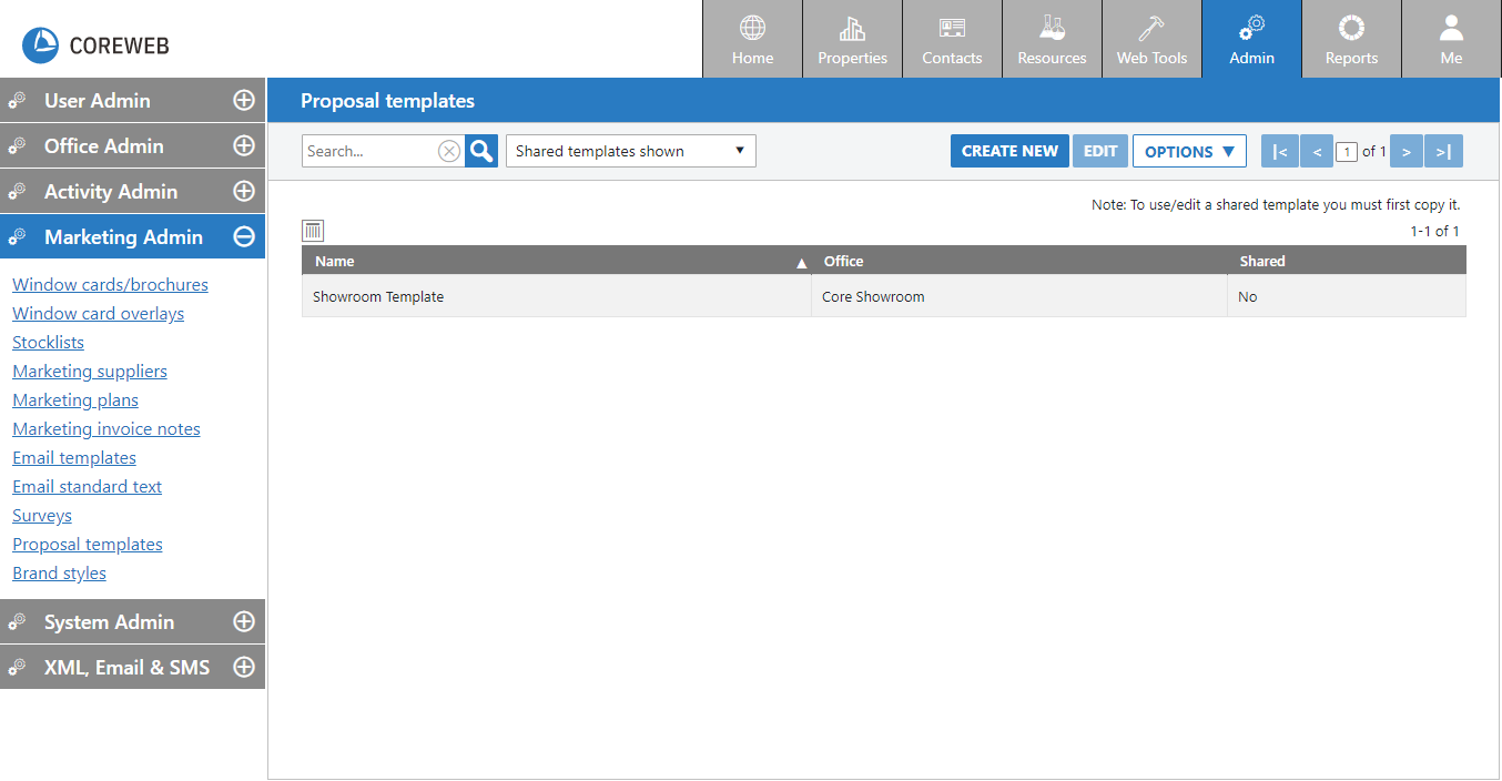 - To start, click on Proposal templates under the Marketing Admin menu. You will be taken to a screen similar to below.