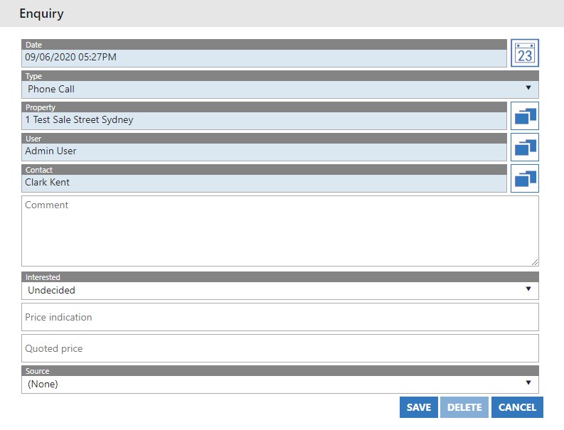 - Once complete, hit the Save button. All enquiries are saved under the Activity tab of the Contact