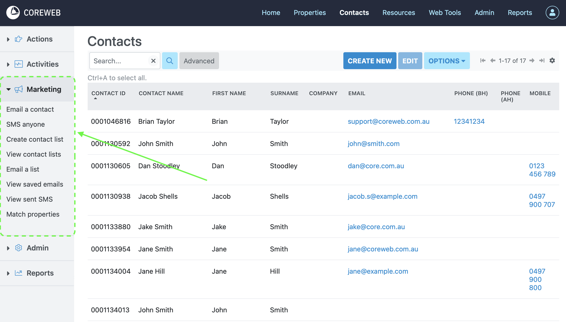 Click on the links below for more information on each function Email a contact SMS anyone Create contact list View contact lists Email a list View saved emails View sent SMS Match properties
