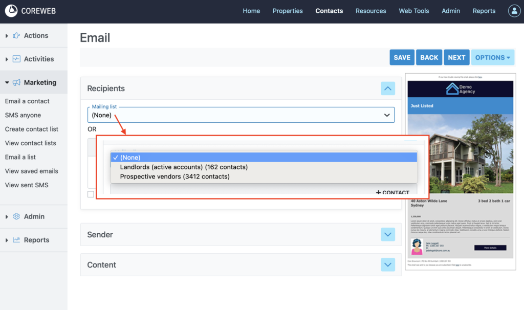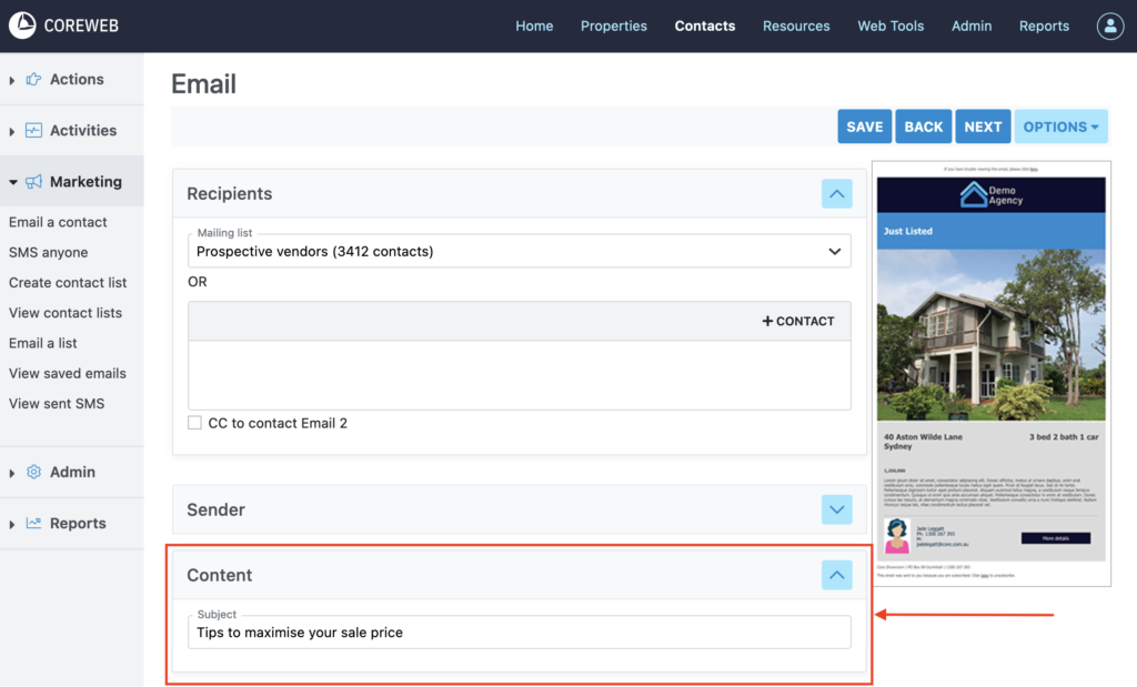 On the compose screen expand the content panel and create your email.  Here you can also press the Preview button to see what your email looks like at this point in time.  Once done, press Next.