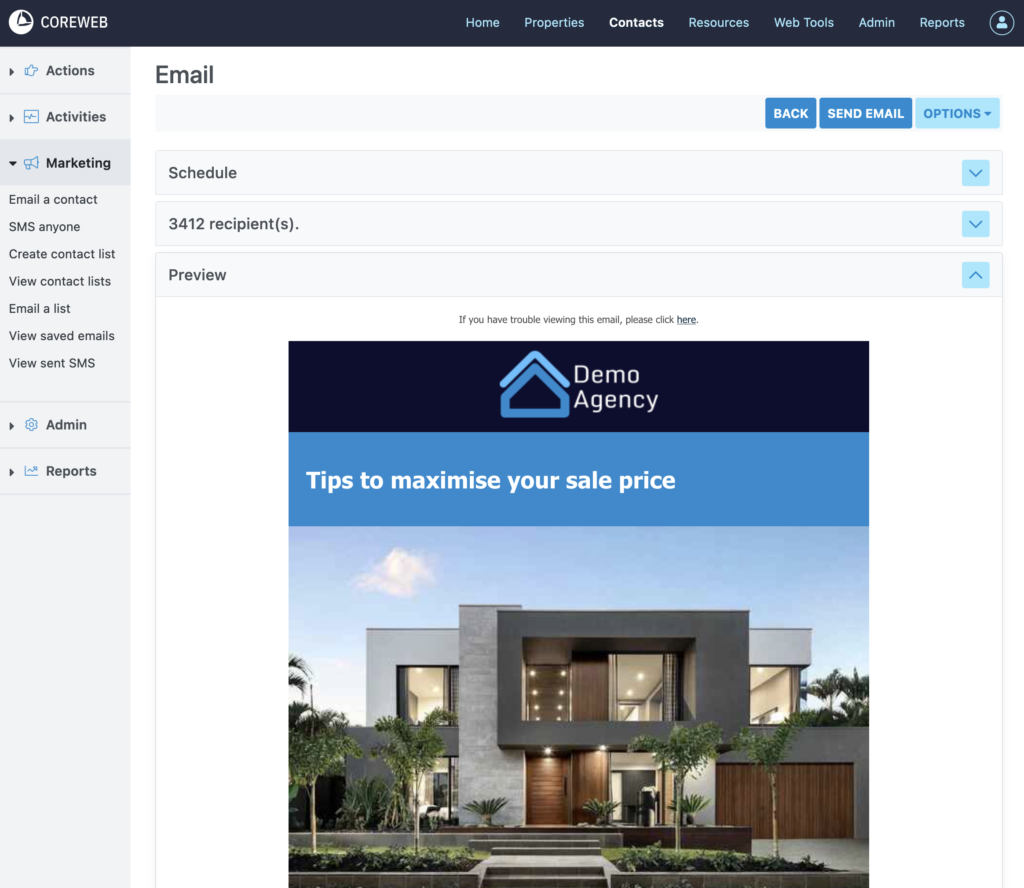 On the final screen you are presented with a preview of your email.  If you wish to send this email at a certain time you can use the Schedule option and can also send a test to yourself using the “Send Test” button at the top of the screen.