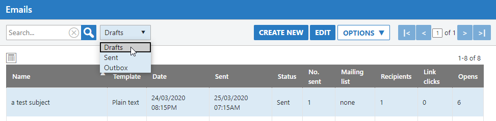 • Click on the View Saved Emails link via the Marketing menu.  The screen below is displayed: