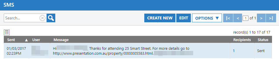 - Click on the View Saved SMS option from the Marketing menu. You will be presented with a list of all of the SMSs that have been sent. You can sort the order of them, search using a keyword to find something specific or open an SMS to see the full detail.