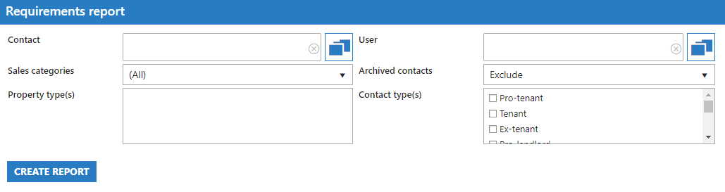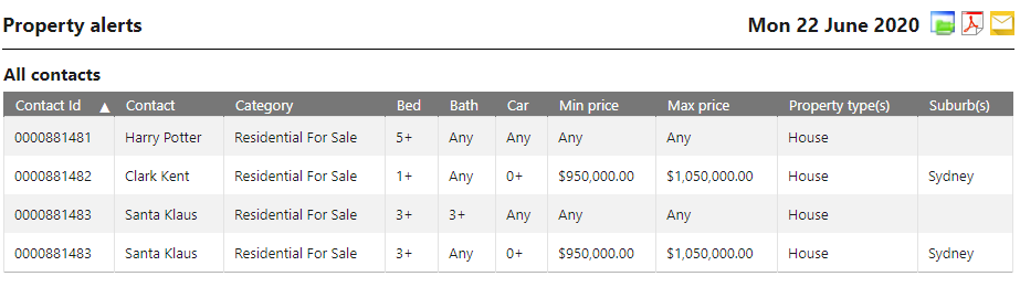 - Select the appropriate criteria to narrow down the results of your report as required. It is advised to run the report excluding archived Contacts so that only your active potential buyers etc are shown. Example output of report below: