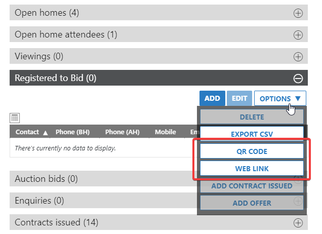 - Once the Auction is over, anyone that has registered using the QR code will be added as a Contact and will appear in the “Registered to Bid” section. You can now communicate with them in relation to this, or future properties.