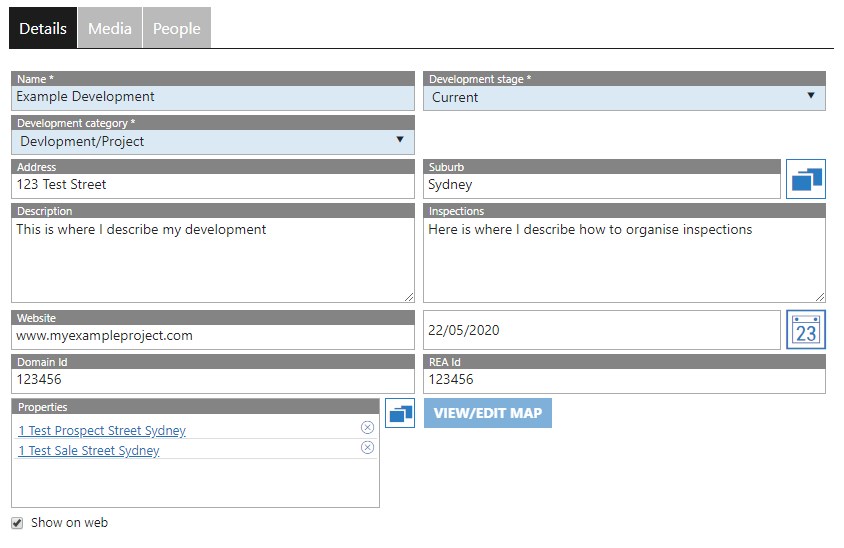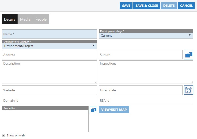 This section gives you the ability to group a number of properties together into a Development/Project to be displayed on your web site
