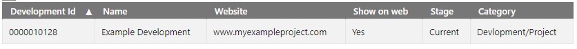 • Once you have added all of the information needed, save your work.  Your newly created Development will appear on the main window: