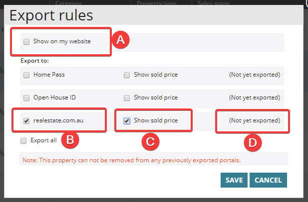 Note: This screen also gives you the ability to turn on or off the sold price (C) and the date and time it was last exported (D) In this example, the property has not yet been exported.
