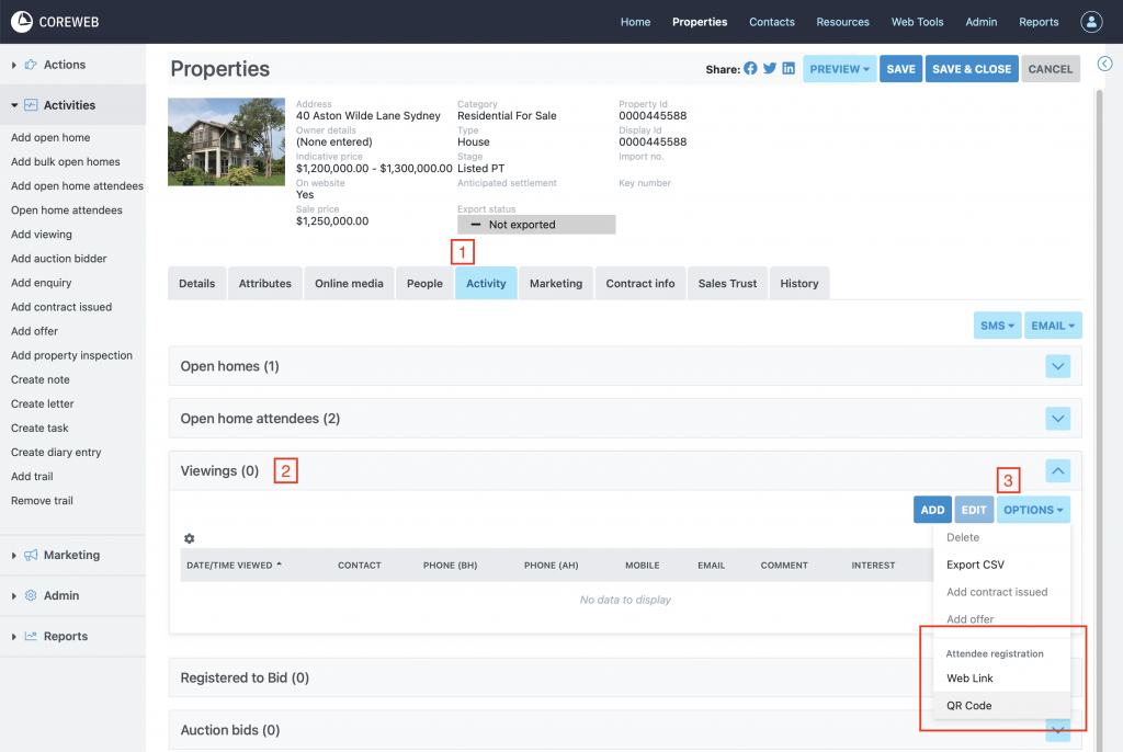 • Open the activity tab, then viewings table for the property. Open the options menu on the viewings table to access the registration “Web Link” and “QR Code”.