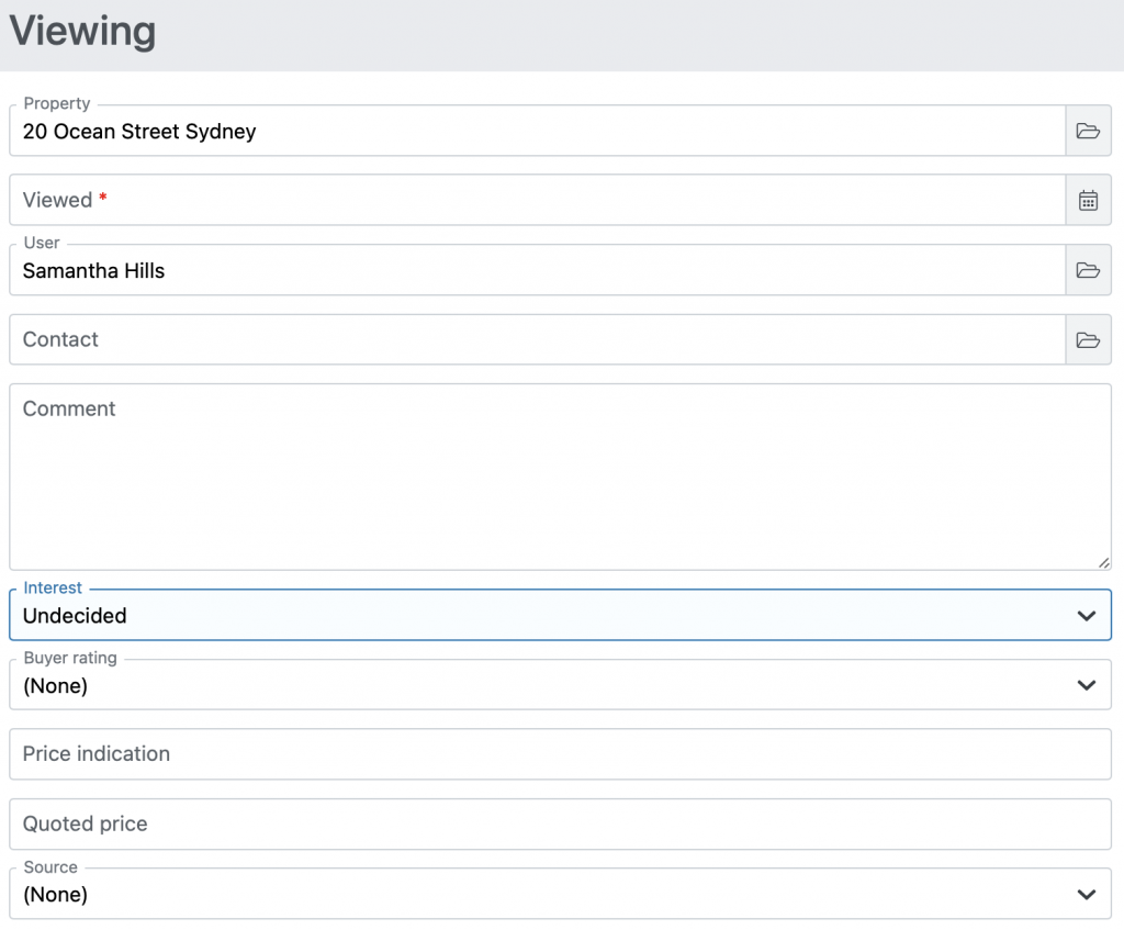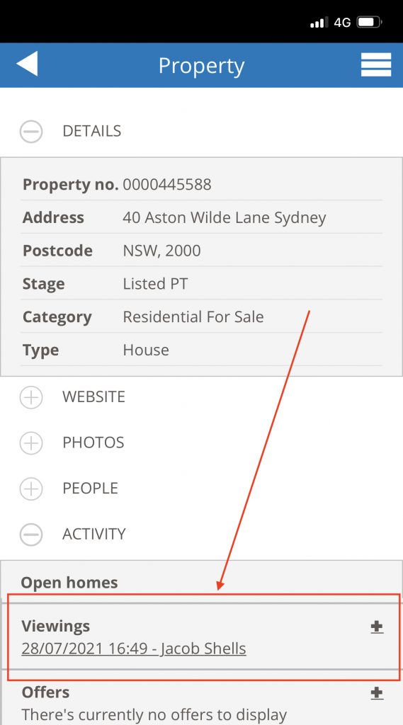 • Once complete, press the Save button. Details of the viewing can be found inside the property details and behaves in the same way as an open home attendee.