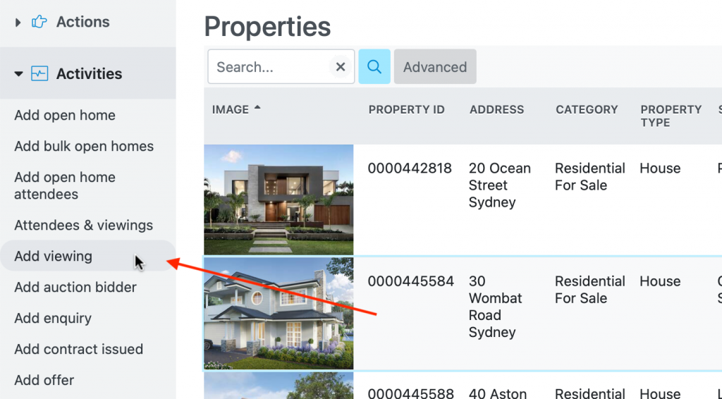 • Either select the property from your property list, or double click to open it, then click Add viewing from the Activities Menu