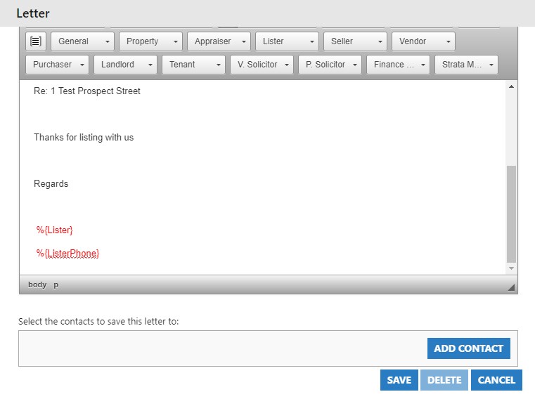 Add communication to People attached to the Property. Ie send a letter to a vendor, buyer etc. Once saved, the letters will appear under the Activities associated with the Property and the Contact if selected. A letter can either be created by using a Letter Template, or simply by attaching something that has been created using other software – A PDF or Word document etc.