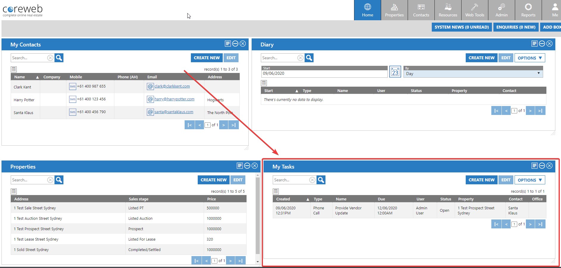 - Once done, press Save. The task appears in the Activity section of the Property. Below is an example of having your Tasks appear on your Home screen. This particular task is now showing there