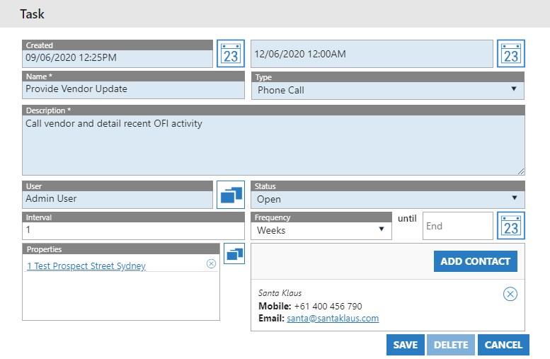 - You may also want to add an interval, and a frequency if the task will repeat. In this example we’ve added an associated Contact as well.