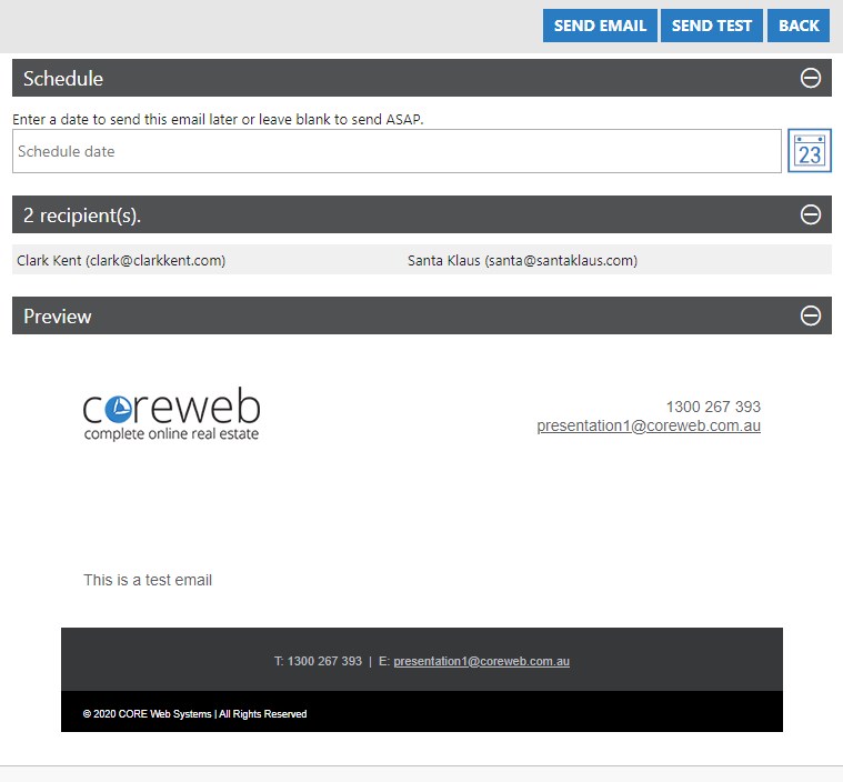 • On this screen you are presented with a summary of your work including confirmation of the recipients, and a preview of the email itself.  If you wish to send this email at a certain time you can use the Schedule option and can also send a test to yourself using the “Send Test” button at the top of the screen.
