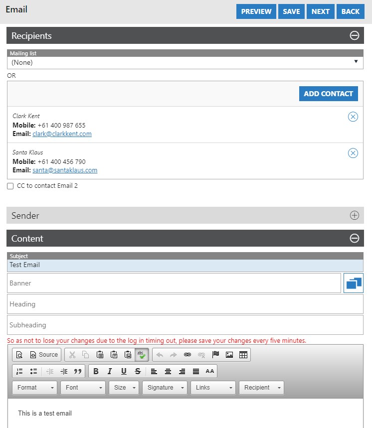 • Here we see that based on our selections, two Contacts have been found. Expand out the Sender field, and the Content field to craft your email.  Here you can also press the Preview button to see what your email looks like at this point in time.  Once done, press Next