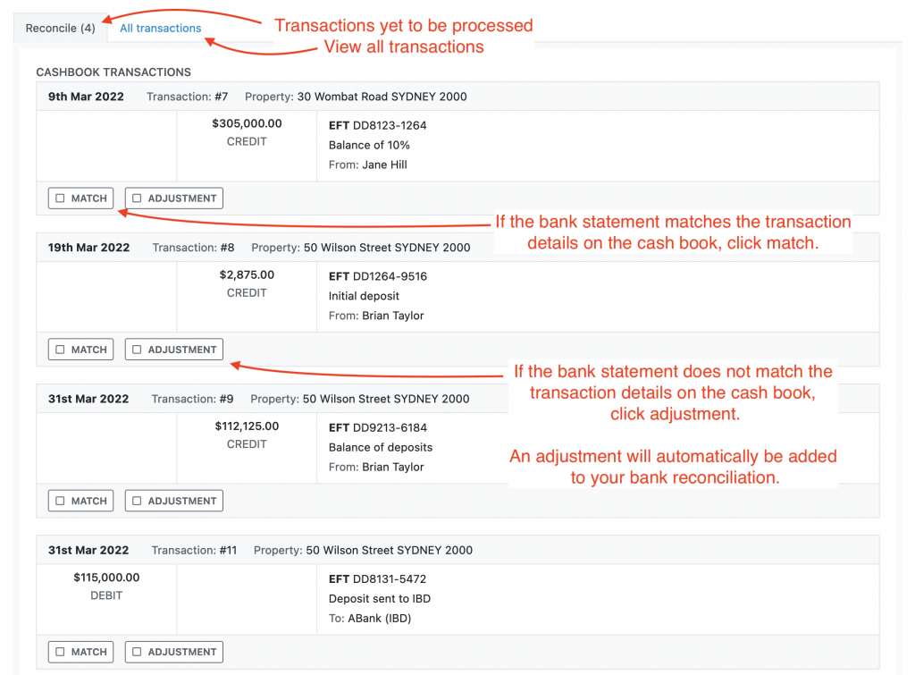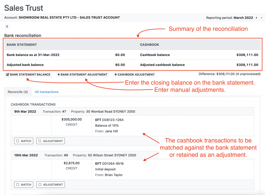Some entries on the bank statement cannot be matched against transactions on the cashbook. For example, bank fees or interest paid into the trust account. For these entries you can enter a manual adjustment to the bank statement: