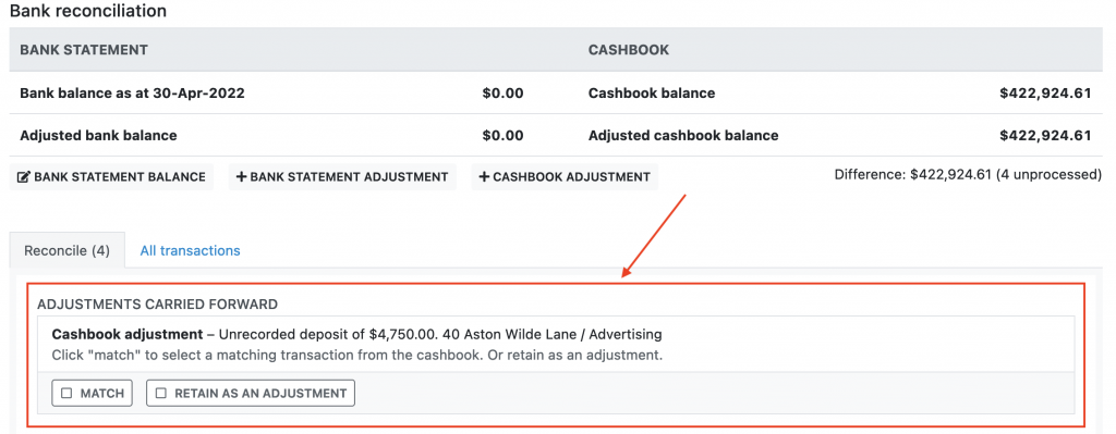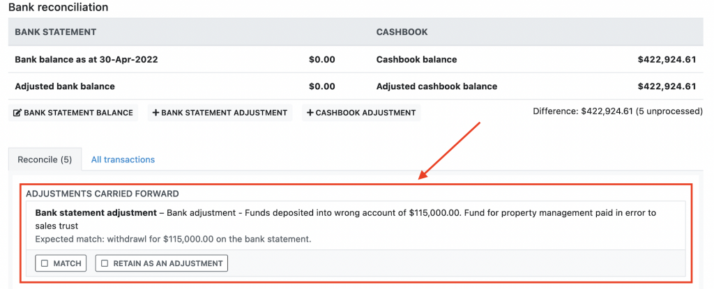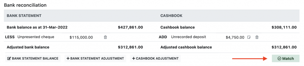 - If the adjustment has a matching entry on the bank statement, click match. The adjustment will be marked as processed.