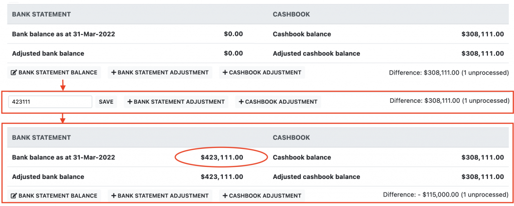 - Click save and to balance will now be shown on the bank reconciliation summary