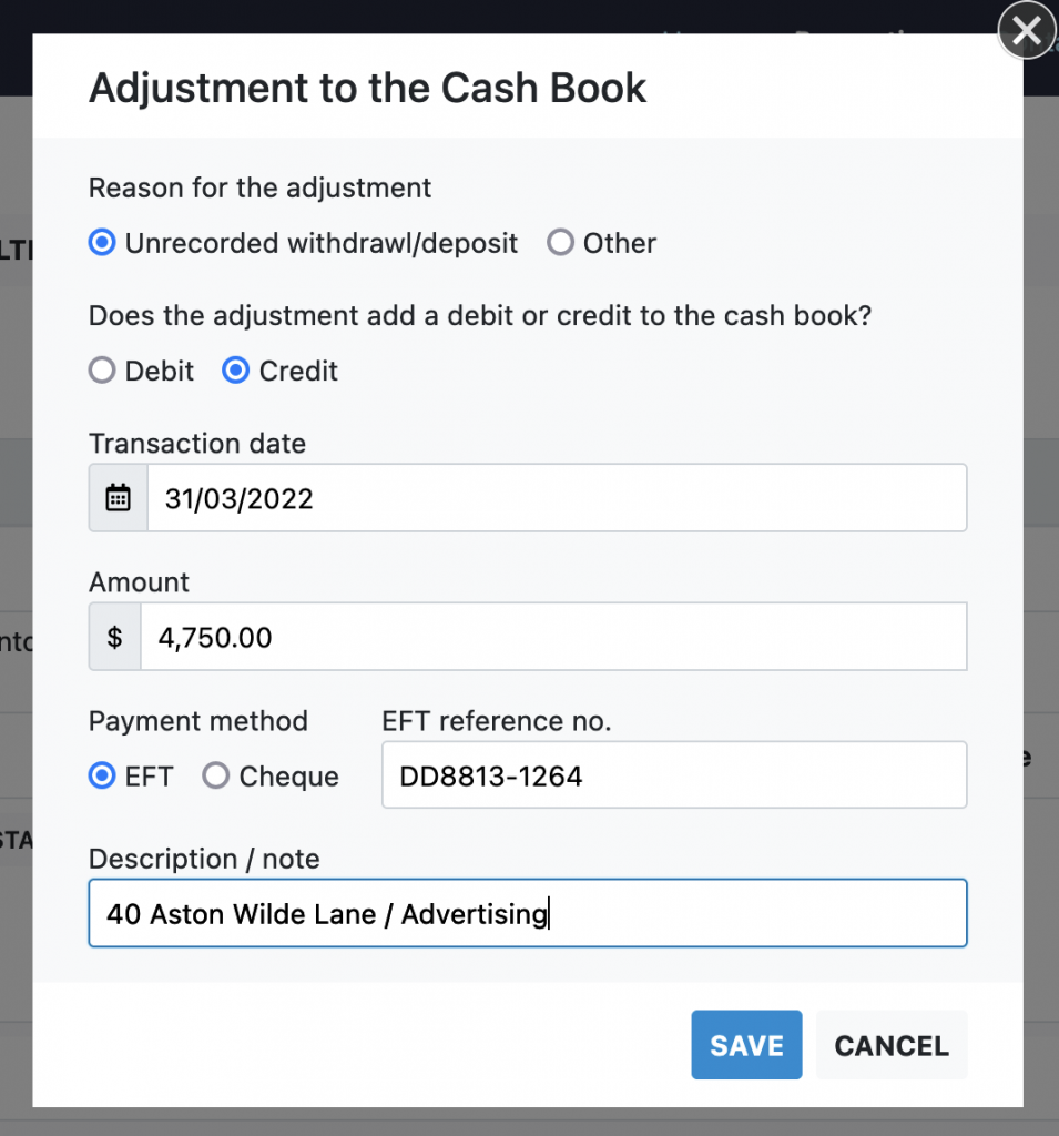 - Enter the details of the transaction as it appears on the bank statement. Make sure the amount is correct as it will need to exactly match a transaction on the cashbook in a later audit period.