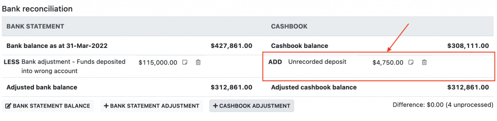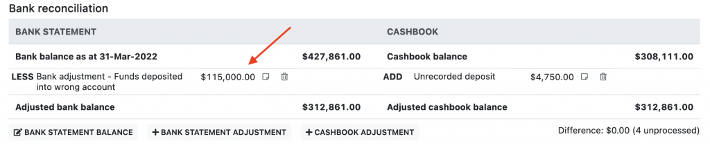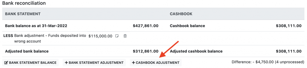 - Timing: The transaction does match between the cashbook and bank statement, except there is a difference in the transaction dates and the transaction on the bank statement does not fall within the same audit period as the cashbook. In this case if the transaction appears on the cashbook it should be marked as an adjustment. Or if the transaction appears on the bank statement, a manual adjustment to the cashbook should be create, see below for instructions.