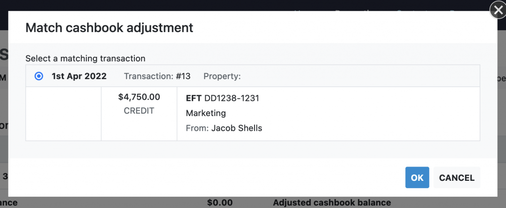 - If the adjustment now has a matching entry in the cashbook, click the match button. You will be shown a list of candidate transactions in the cashbook to match against. Select the matching transaction and click continue.