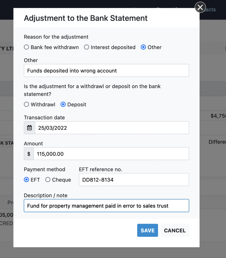 - Enter the details of the entry on the bank statement for which you are creating the adjustment. In this example, we have found a deposit into the trust account that was intended for another account, so “Other” had been chosen as the reason for the adjustment.