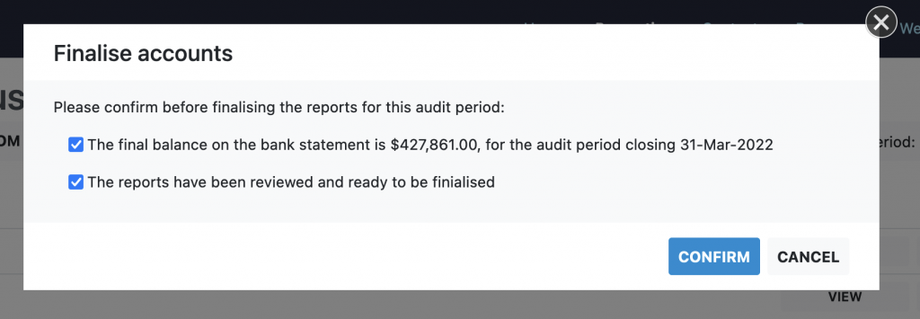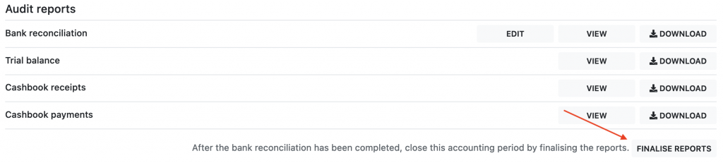 Once you have completed the bank reconciliation and reviewed the audit reports you can close the finalise the accounts for this audit period.