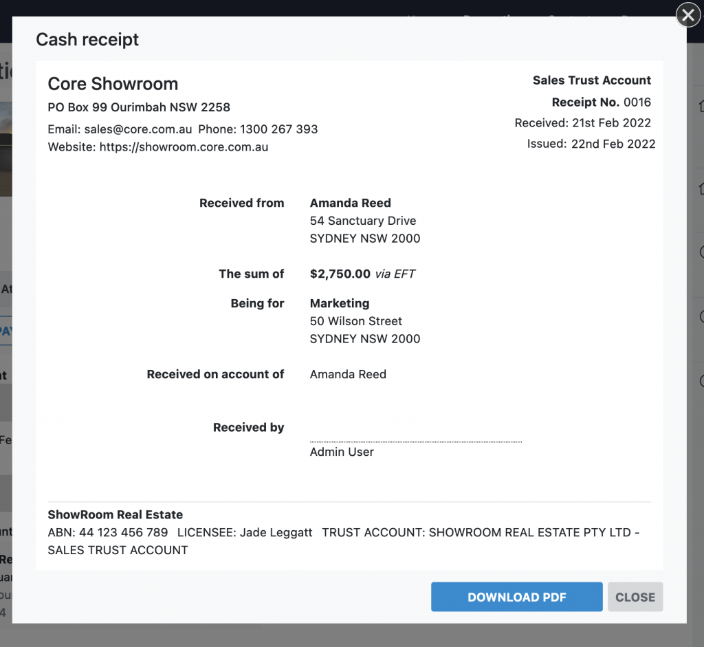 A cash receipt is automatically generated after saving the transaction. A PDF copy of the receipt you can print or email to the payee can be download.