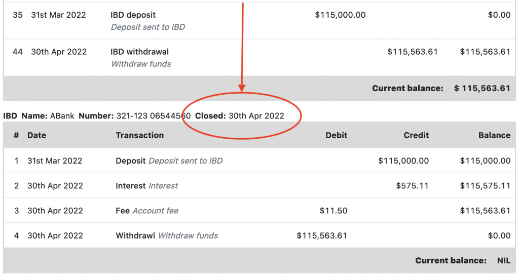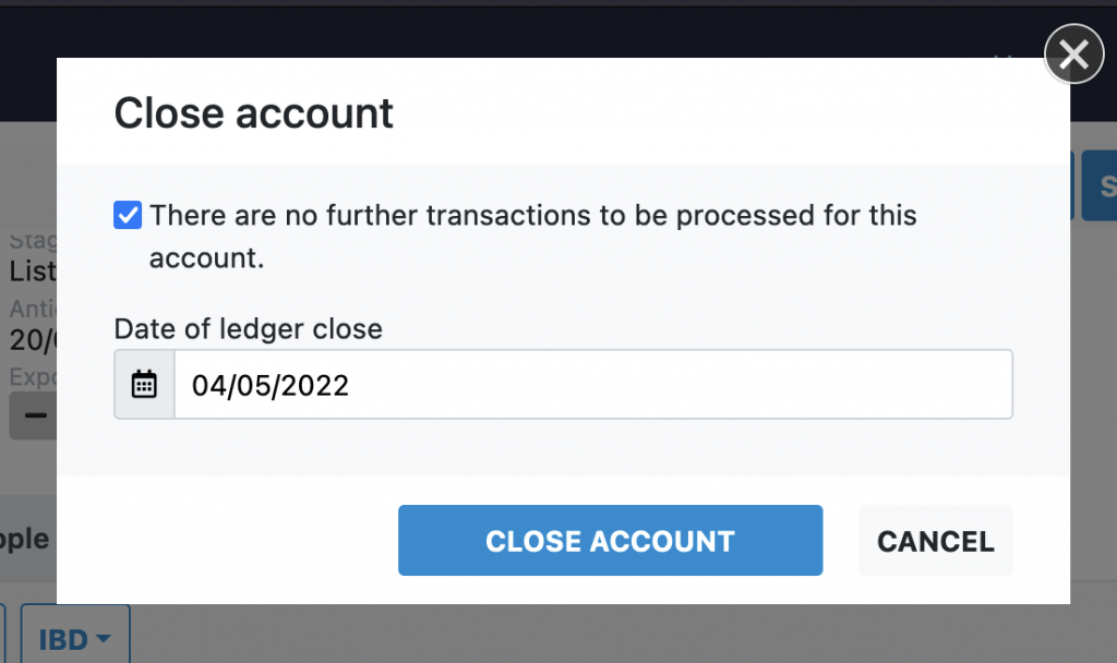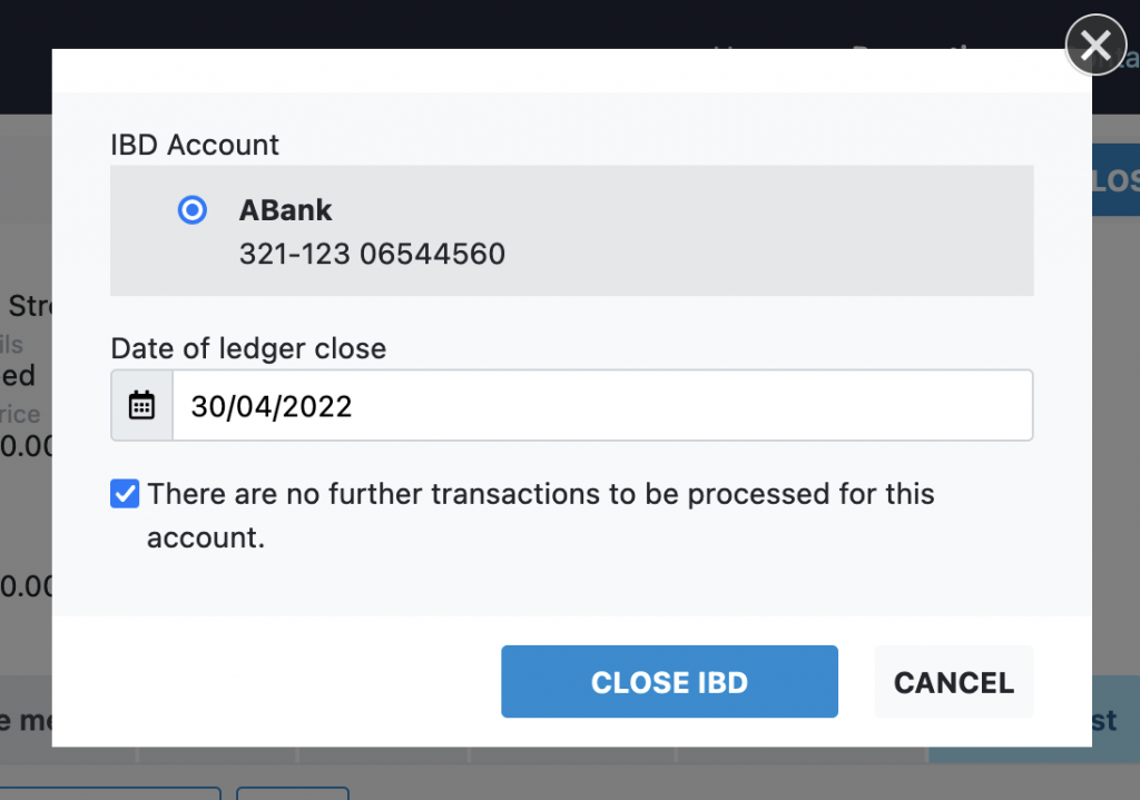 Once the IBD account has been closed you can close the associated ledger. Open the IBD menu and click on “Close IBD”. Enter the date the account was closed. The close date will be shown next to the IBD ledger.
