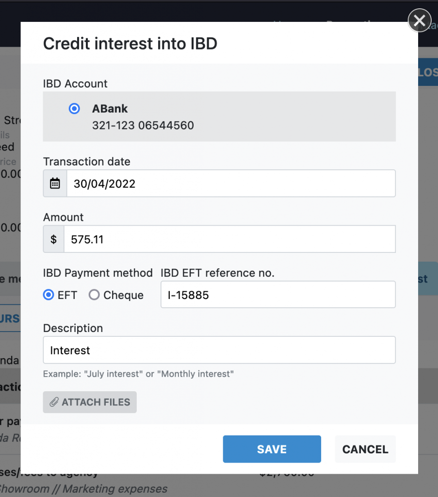 To record an interest payment into the IBD, open the IBD menu and click on “Credit interest to IBD”. Enter the details of the payment: