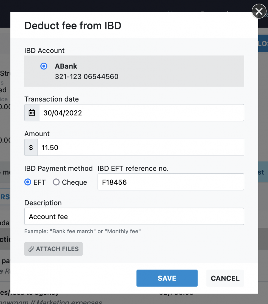 To record a deduction of fees from the IBD, open the IBD menu and click on “Credit interest to IBD”. Enter the details of the deduction: