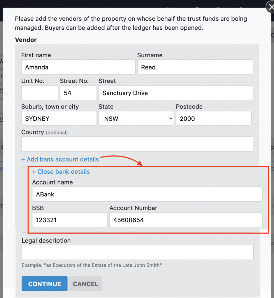• If the contact is acting in a legal capacity for the vendor, you can enter their legal title. This is commonly used for trustees of deceased estates. This title is shown on receipts and vendor statements.