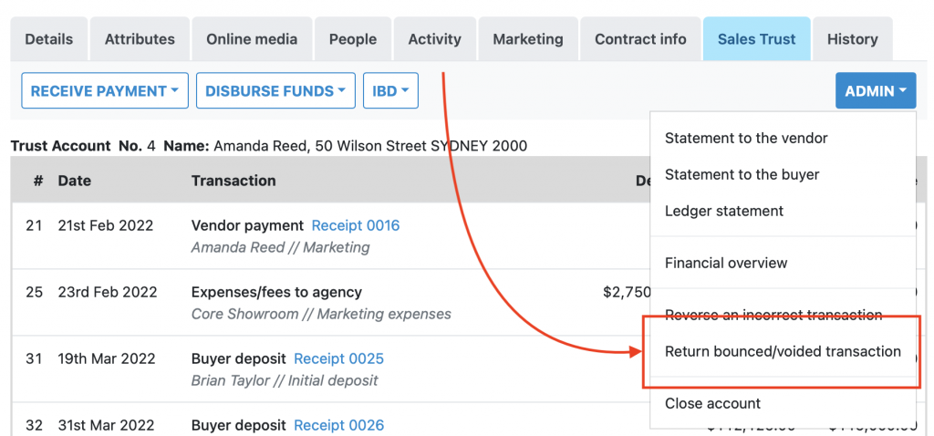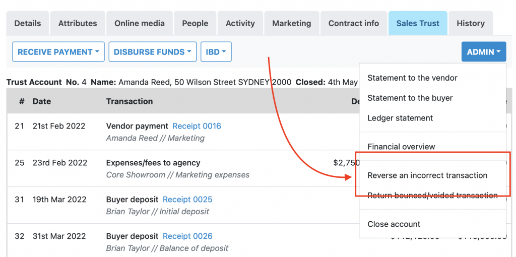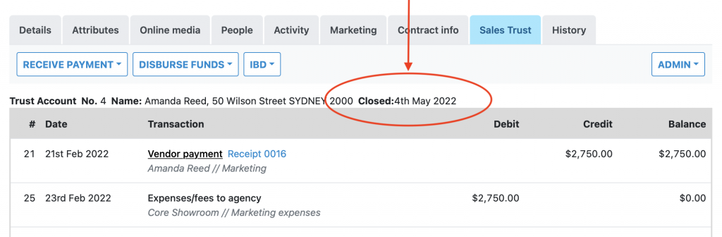 Once the all the funds have been disbursed from this ledger you can close the ledger. Open the Admin menu and click on “Close account”. Enter the date the ledger was closed, typically the date of the last transaction. The close date will be shown next to the property ledger.