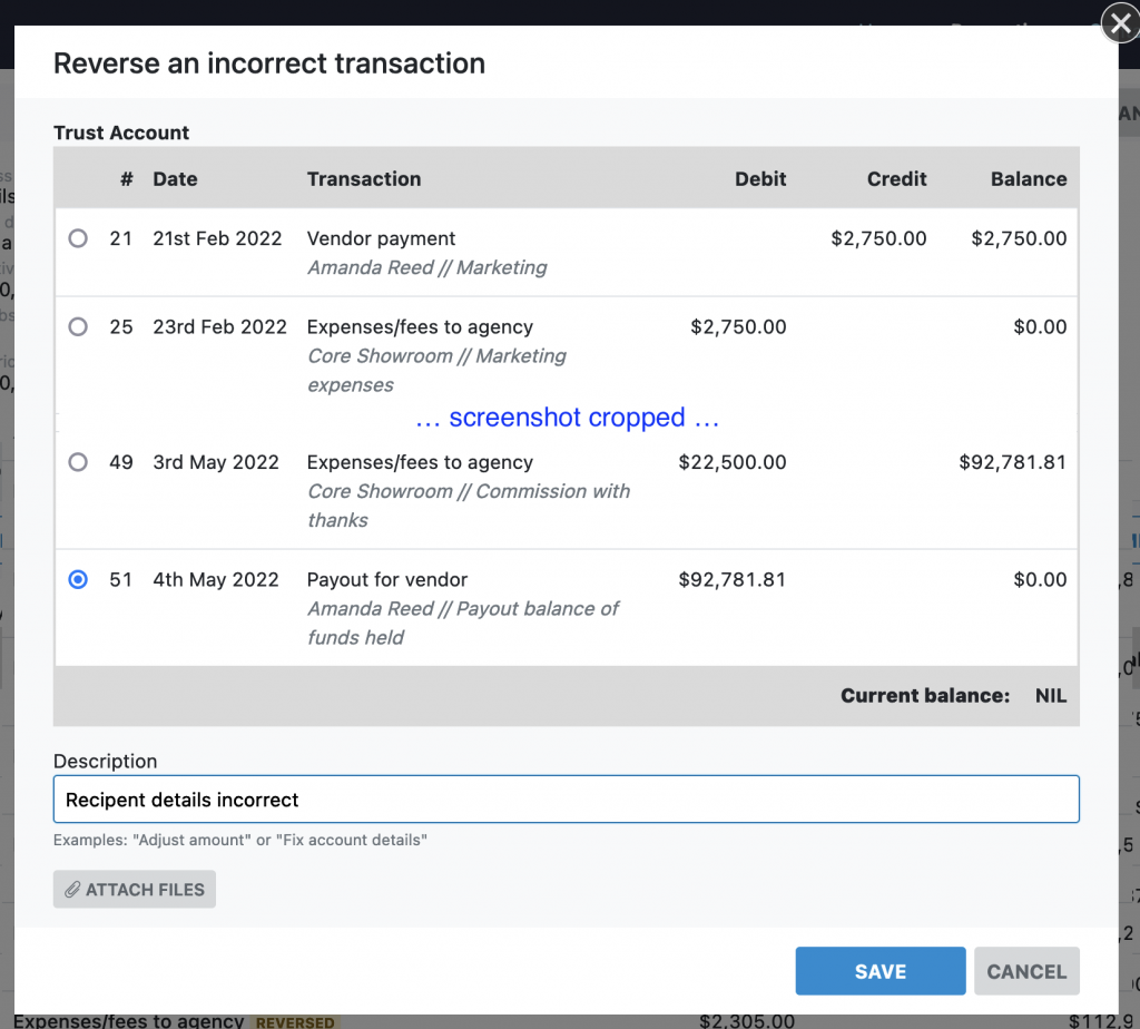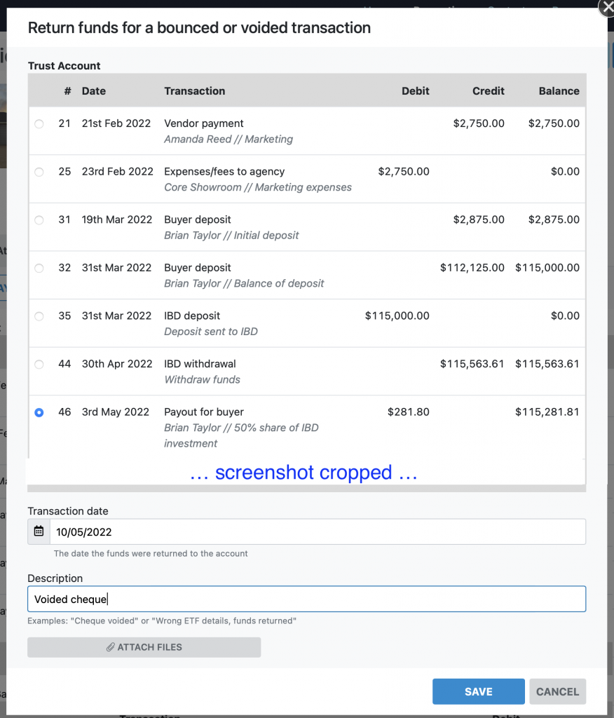 Select the transaction whose funds were later returned to the trust account. Enter the date the funds were returned and a description. If have a reference number for the transaction you can add this to the description.