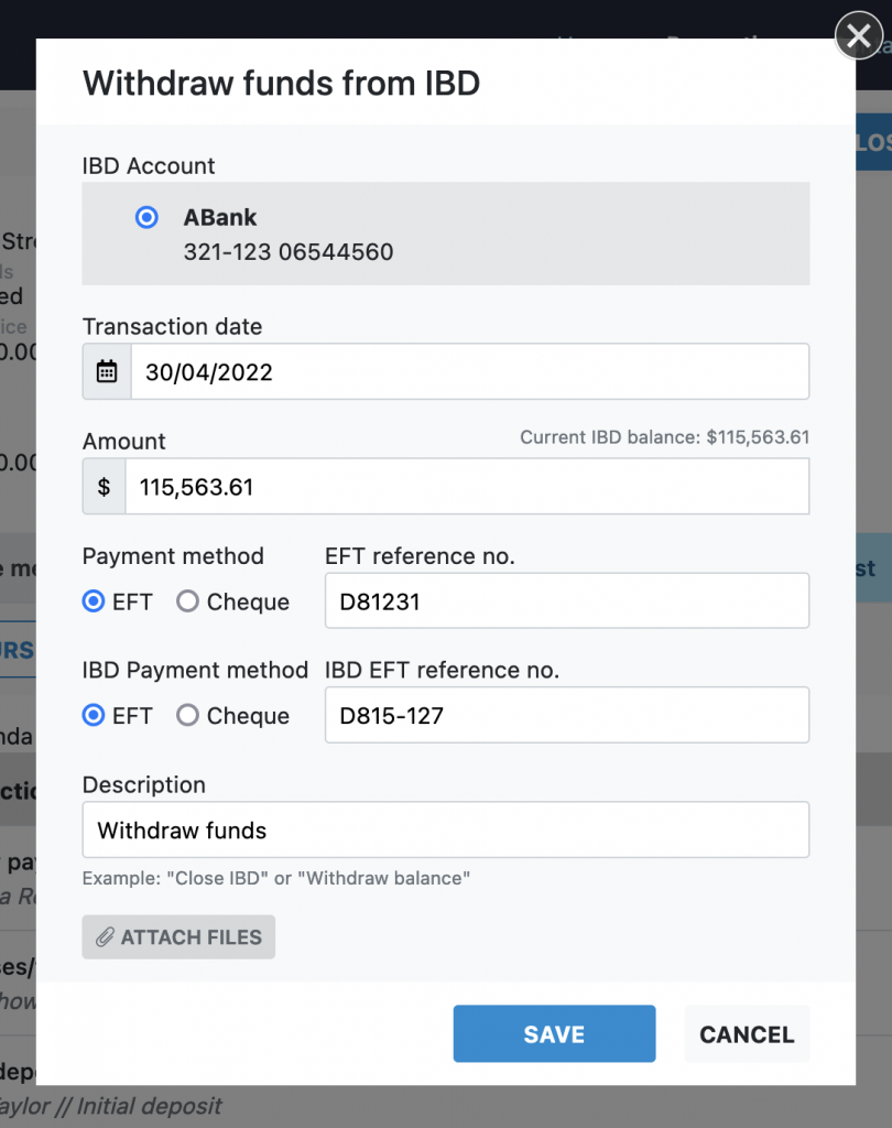 To move funds from the IBD back to the trust account, open the IBD menu and click on “Withdraw funds from IBD”. Enter the details of the withdrawal:
