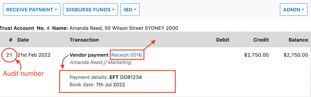 The funds will now show as withdrawn from the IBD and deposited to the trust account ledger.