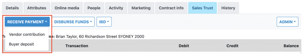 Click receive funds menu. Select between a “vendor contribution”, typically for advertising funds, or “buyer deposit”. See below for instructions on receiving funds from a third party on behalf of a buyer or vendor.